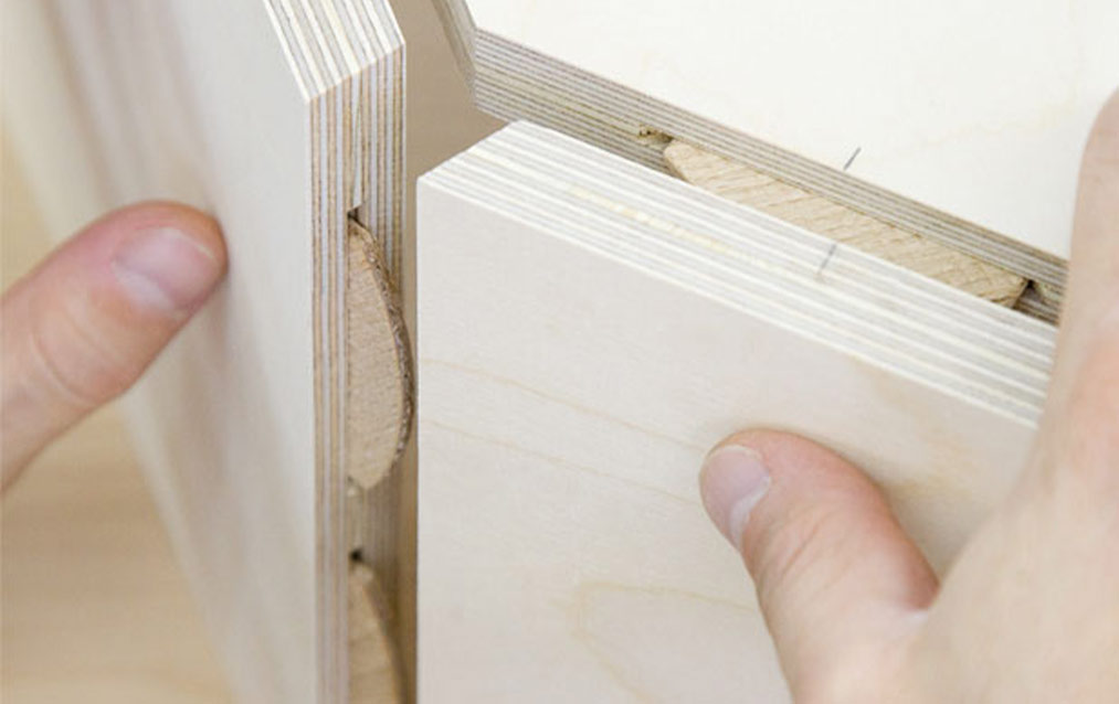 Podczas składania klej aplikuje się bezpośrednio do szczelin, nie na lamelki - te ostatnie mogą przedwcześnie spęcznieć i utrudnić montaż. Po włożeniu lamelek do zaklejonych szczelin elementy łączy się i ściska, pamiętając o szybkiej pracy ze względu na błyskawiczne pęcznienie lamelek bukowych.