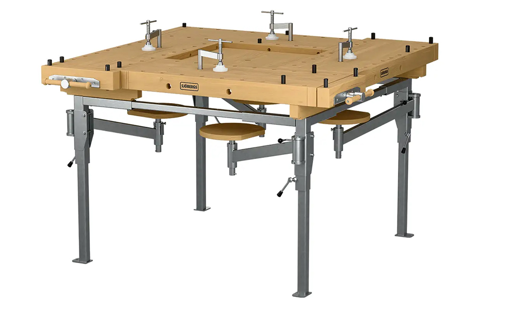 Przy każdym stanowisku roboczym znajdziesz profesjonalne imadło stolarskie o rozwarciu 130 mm oraz komplet 4 imaków umożliwiających mocowanie długich elementów podczas strugania. System otworów w blacie i z przodu stołu pozwala na zastosowanie dodatkowych docisków szybkomocujących, znacząco rozszerzając możliwości pracy.