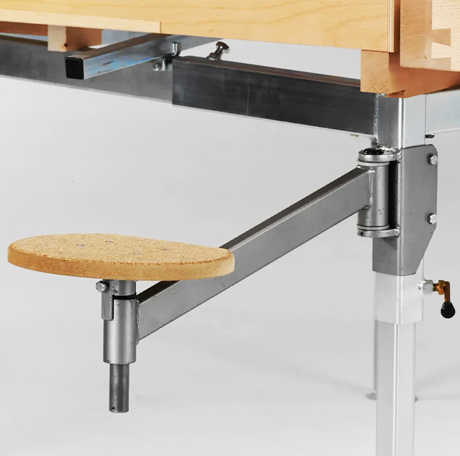 - Wersja z siedziskami – identyczna konstrukcja, ale z siedziskami na wysięgnikach. Waga: 78 kg. Rozwiązanie dla pracowni, gdzie prowadzone są długie zajęcia z precyzyjnymi pracami montażowymi czy wykańczaniem.