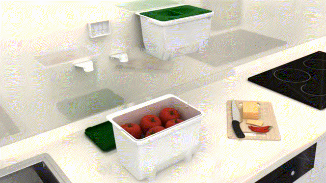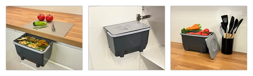Pojemnik jest wyposażony w nóżki, dzięki czemu można go stabilnie postawić na płaskiej powierzchni. Szczelna, zdejmowana pokrywa zapobiega wydostawaniu się nieprzyjemnych zapachów i zapewnia łatwe otwieranie i zamykanie. Pojemnik dostarczany jest z plastikowym sitkiem, dzięki któremu odpady nie mają bezpośredniego kontaktu z wodą czy sokami, które mogą się gromadzić na dnie.