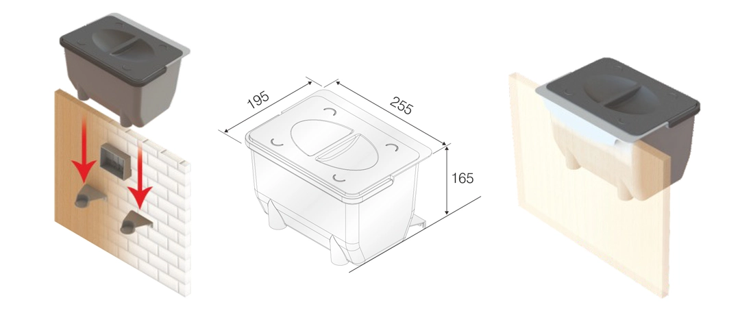 Pojemnik można zamontować na dwa sposoby - przy pomocy dostarczonych uchwytów do ściany, drzwiczek szafki (np. od wewnątrz) lub przy pomocy specjalnego zaczepu, można zawiesić go na drzwiach o szerokość 18-20 mm.