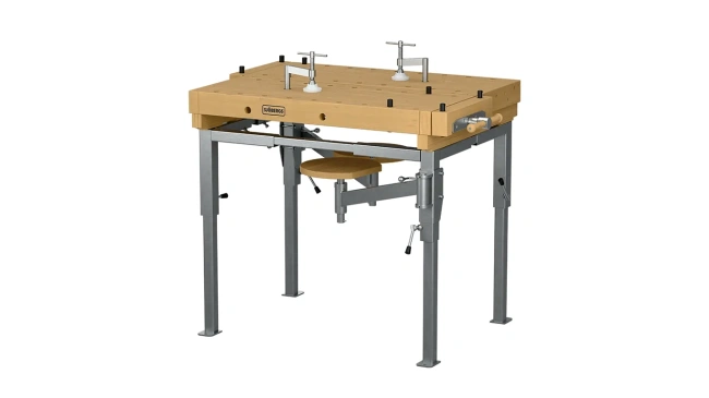 Podwójny rząd otworów w blacie umożliwia precyzyjne pozycjonowanie imaków (4 sztuki na stanowisko w zestawie). Każde stanowisko wyposażone w imadło stolarskie o rozwarciu szczęk 130 mm. System mocowania uzupełniają profesjonalne ściski stolarskie, dając pełną kontrolę nad obrabianym materiałem.