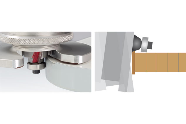 - Prosta, bezstopniowa i precyzyjna regulacja głębokości frezowania poprzez obrót płyty podstawy,