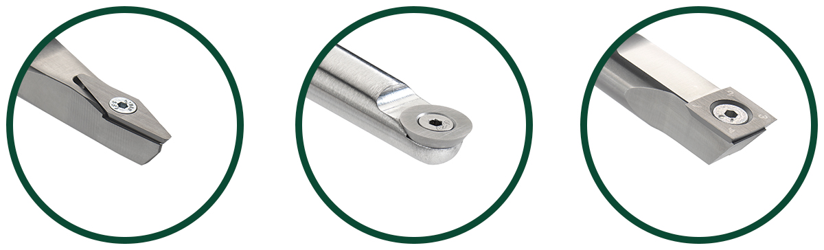 W zestawie znajdują się trzy niezbędne narzędzia tokarskie z wymiennymi końcówkami z węglika spiekanego do czystego, precyzyjnego kształtowania i cięć tnących, do szybkiego usuwania materiału i do precyzyjnych detali i wąskich przestrzeni. Każde narzędzie zostało zaprojektowane z myślą o maksymalnej efektywności i kontroli podczas toczenia.