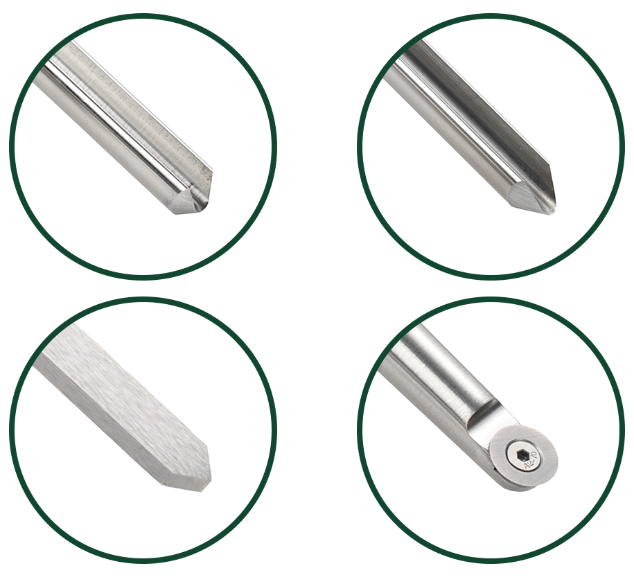 Dłuta wykonane są ze stali M2 (S600) HSS (High Speed Steel) o twardości 60-64HRC w skali Rockwella (hartowane w kąpieli solnej). Stal HSS, z której wykonane są ostrza zapewnia dłuższą żywotność i wytrzymałość krawędzi tnącej.