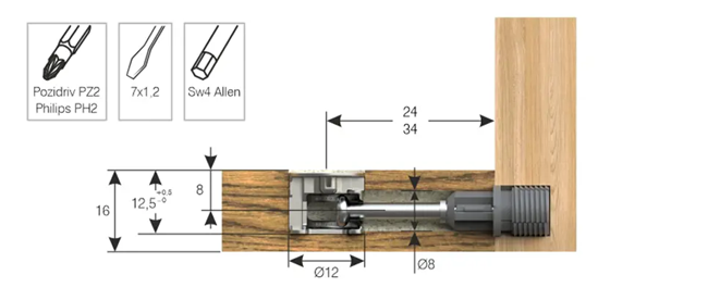 Złącze stworzone do łączenia mebli, płyt i drewna o grubości 16 mm i składa się z puszki mimośrodu o średnicy 15 mm i trzpienia dostępnego w różnych konfiguracjach:
