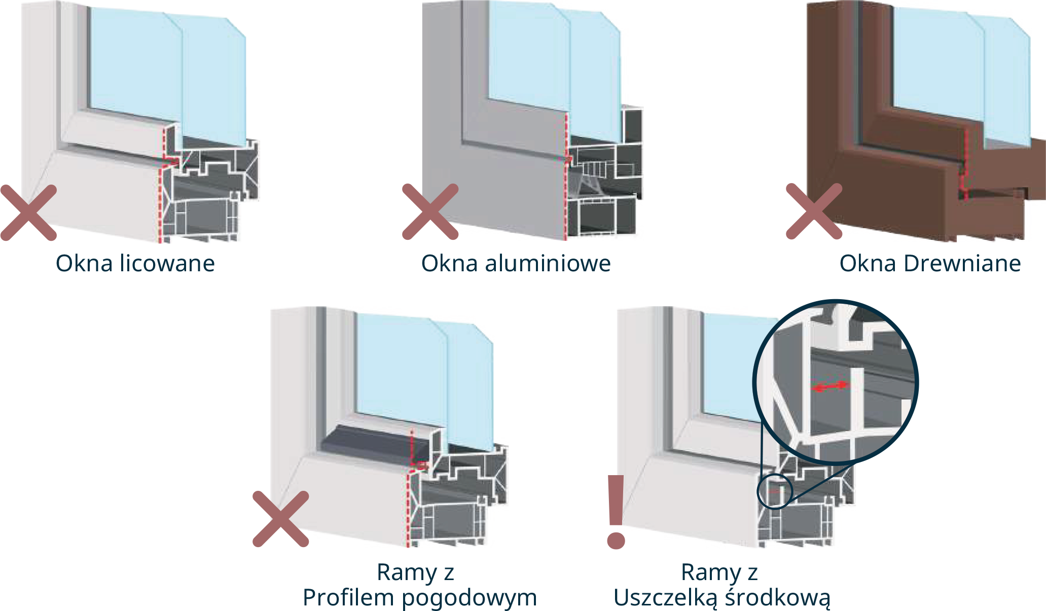 FlexScreen zazwyczaj wymaga adaptera w przypadku okien licowanych z ramą oraz okien z profilem pogodowym. W przypadku ram okiennych z uszczelką środkową konieczna jest minimalna odległość 12 mm między uszczelką a ramą. Standardowe rozwiązanie FlexScreen może nie pasować do niektórych modeli okien drewnianych ani aluminiowych bez zastosowania dodatkowego adaptera. Przed zamówieniem warto dokładnie zmierzyć ramę okienną i sprawdzić, czy parametry okna odpowiadają wymaganiom montażowym FlexScreen .