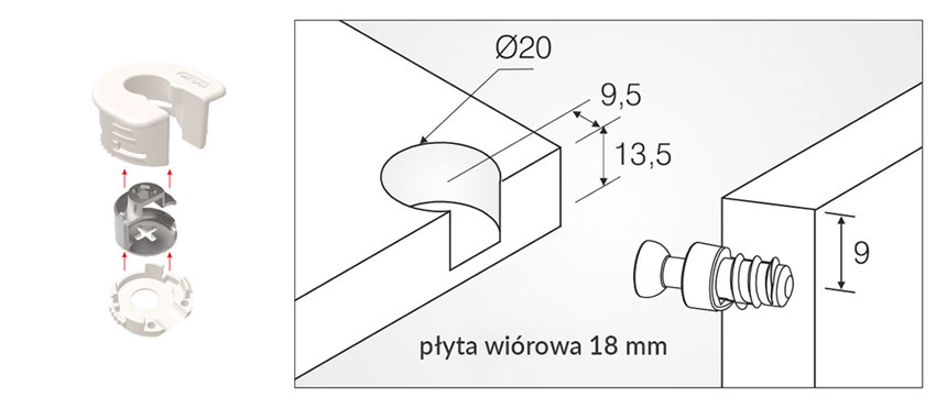 Raffix Locked to skręcane złącze meblowe, które idealnie nadaje się montażu półek i połączeń narożnikowych.