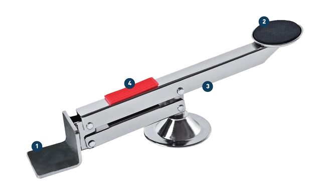 Podnośnik wyposażony jest w mocną stopkę z gumową nakładką (1), która zapewnia stabilne podparcie podnoszonych przedmiotów i jednocześnie chroni je przed uszkodzeniem. W celu precyzyjnego sterowania i zapewnieniu lepszej przyczepności pedał wyposażony został w nakładkę gumową (2). Solidna, niklowana metalowa konstrukcja (3) gwarantuje trwałość, a czerwona osłona PVC (4) ułatwia dokładne pozycjonowanie narzędzia.