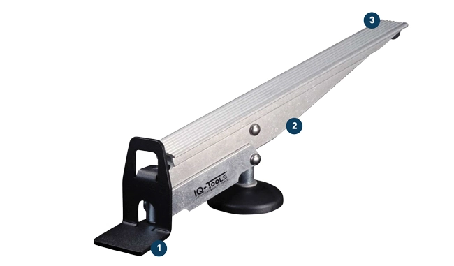 Podnośnik wyposażony jest w mocną, obrotową stopę z gumowaną nakładką (1), dzięki czemu podnoszenie i odchylanie elementów odbywa się bez ryzyka ich uszkodzenia. Optymalne przenoszenie siły w stosunku 1.7:1 i stabilna konstrukcja z aluminium (2) wraz z dodatkową nakładką gumową nad podstawie pozwalają na efektywne podnoszenie ciężkich obiektów bez potrzeby użycia dużej siły.