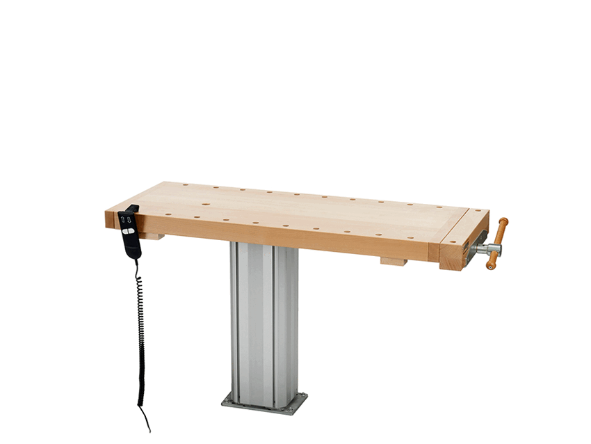Na wytrzymałość stołu składają się lakierowany, bukowy blat o grubości 60 mm, mocne imadło i stabilna, masywna ruchoma podstawa.