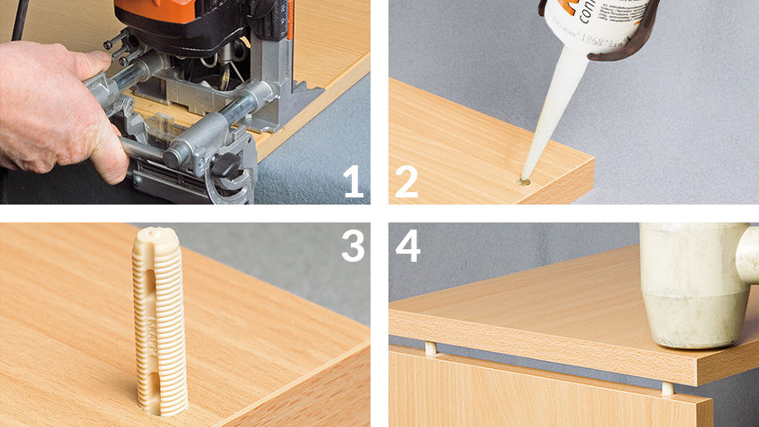 1. Wywierć otwory pod kołki np. za pomocą szablonu, elektronarzędzia, maszyny - Pantorouter.