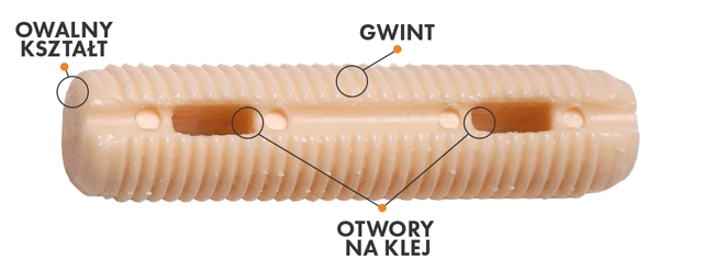 • Delikatnie owalny kształt eliminuje ryzyko wybrzuszenia materiału podczas wbijania kołka.