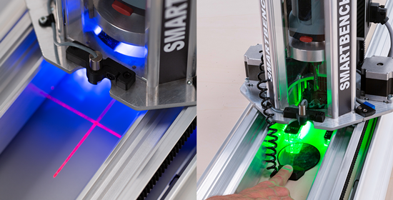 Głowica z laserem krzyżowym i płytkę próbkującą, dzięki którym z łatwością ustawisz pozycje odniesienia w osiach X, Y i Z.
