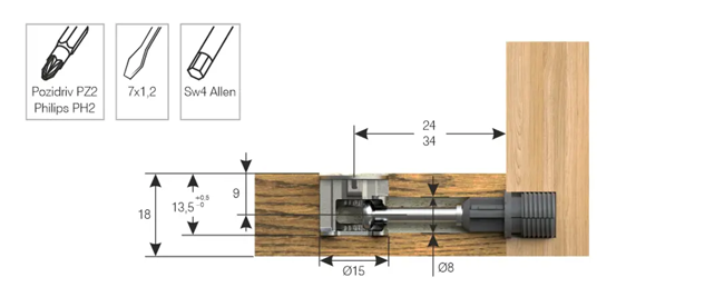 Złącze mimośrodowe o średnicy 15 mm to jedno z najbardziej popularnych złączy w przemyśle meblarskim, które pozwala tworzyć rozłączne połączenie, bez konieczności stosowania kleju w materiałach o grubości 18mm. Złącze składa się z dwóch elementów – puszki mimośrodu oraz trzpienia dostępnego różnych opcjach: