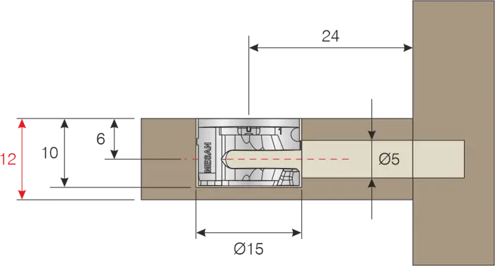 Złącze przeznaczone jest do montażu mebli z płyt o grubości 12 mm i składa się z mimośrodu (puszki) o średnicy 15 mm i wysokości 10 mm oraz trzpienia 24 mm o długości całkowitej 32 mm z gwintem M4.