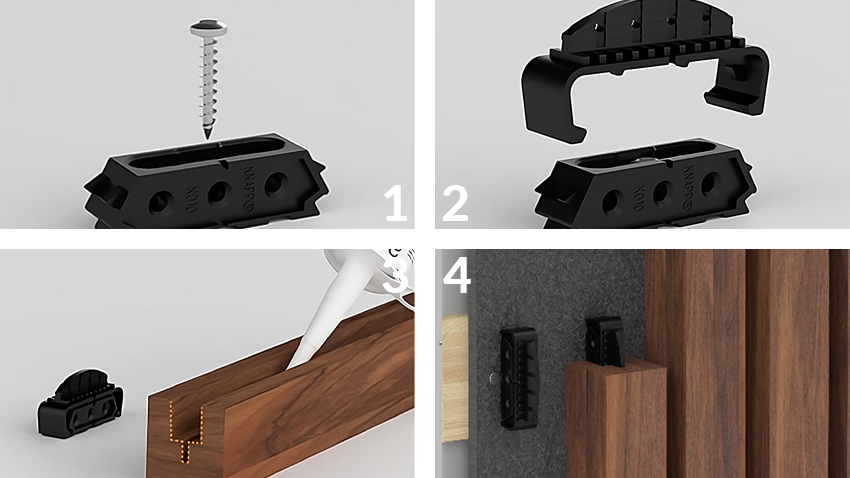 DEKLICK to innowacyjne złącze, które pozwala na szybki montaż paneli akustycznych, ścian dekoracyjnych, listew, okładzin ściennych, ekspozycji, oznakowania i wielu innych elementów montowanych zarówno w orientacji pionowej jak i poziomej. Złącze zostało wykonane z wytrzymałego tworzywa sztucznego odpornego na promieniowanie UV i warunki atmosferyczne, dzięki czemu może być stosowane zarówno do użytku: